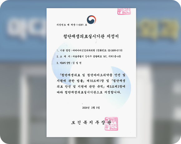 본 의료기관은 보건복지부가 인증한 첨단재생의료 실시기관으로, 국가가 인정한 재생의료법에 따른 관리·감독 체계 하에서 보다 안전하고 신뢰할 수 있는 줄기세포 치료를 시행합니다.